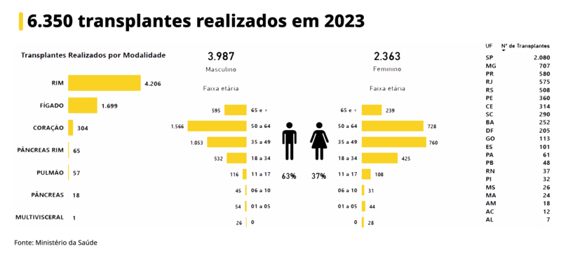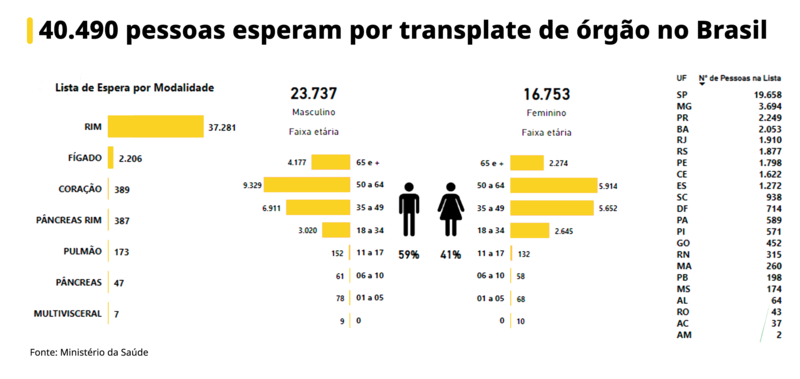 De acordo com o levantamento diário feito pelo Ministério da Saúde, até o dia 21 de setembro deste ano, 37.281 pessoas esperavam por um rim no Brasil. O estado de São Paulo lidera com mais pacientes, 19.658. Por outro lado, também é o órgão mais transplantado, foram 4.206 cirurgias desse tipo só em 2023.