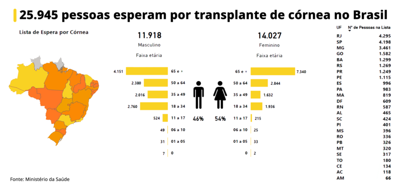 A lista de espera por uma córnea soma 25.945 pessoas. Segundo a oftalmologista Fabíola Gavioli, para doar a córnea não é necessário ter compatibilidade sanguínea, de idade, física, “porque o que a gente leva em consideração é a avaliação do tecido, a quantidade de células, a vitalidade que ela tem.”