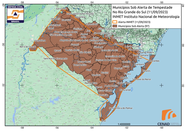 As fortes chuvas poderão atingir 97 municípios do centro-sul do Rio Grande do Sul, com possibilidade de inundações, vendavais, descargas elétricas e queda de granizo. A previsão é de 200 milímetros de chuva nas próximas 72 horas, podendo chegar a até 300 milímetros. Áreas já atingidas pelo ciclone da semana passada podem ser novamente afetadas, mas a incidência deve ser maior nas áreas onde há estiagem, sobretudo na região de fronteira com o Uruguai.