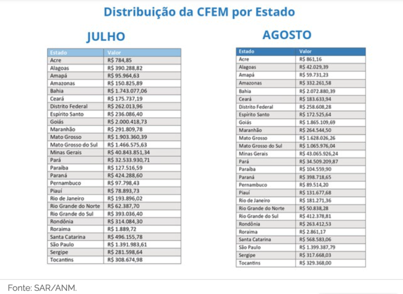 Foram depositados quase R$ 900 milhões nas contas dos governos estaduais, do Distrito Federal e de mais de 2 mil prefeituras de municípios diretamente impactados pela atividade. O dinheiro refere-se à cota-parte dos chamados royalties pela exploração mineral, em relação ao que foi produzido de minérios em julho e agosto de 2023. A CFEM é uma compensação que os produtores de minérios recebem por possíveis danos causados pela exploração mineral realizadas nos territórios impactados pela atividade.