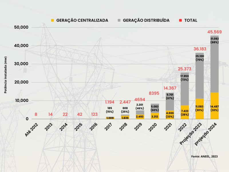 Pela projeção, em 2024, serão adicionados mais de 9,3 gigawatts (GW) de potência instalada, chegando a um total acumulado de mais de 45,5 GW, o equivalente a mais de três usinas de Itaipu.
