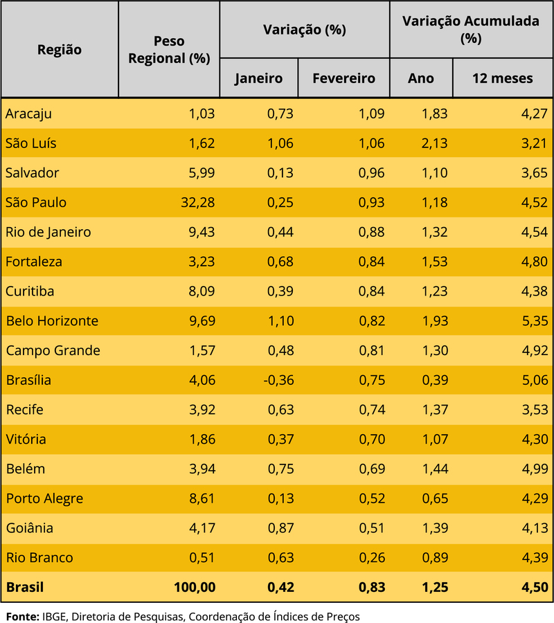 No que diz respeito aos índices regionais, por capital, todas as áreas pesquisadas apresentaram alta nos preços. A maior variação foi na capital sergipana. Aracaju contou com elevação de 1,09%. O resultado foi puxado pela alta da gasolina, que subiu 10,45%. O menor resultado, por sua vez, foi notado em Rio Branco, no Acre, com variação de 0,26%, puxado pela queda nos preços da passagem aérea, que recuaram 19,37%.