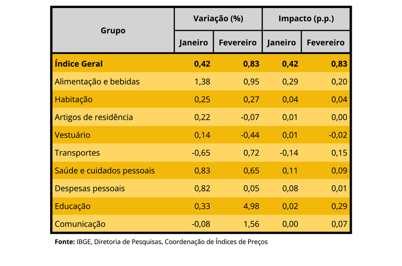 A inflação do Brasil apresentou alta de 0,83% em fevereiro de 2024, após fechar janeiro em 0,42%. O resultado foi influenciado, principalmente, pelos preços do grupo de Educação, que registraram salto de 4,98%.