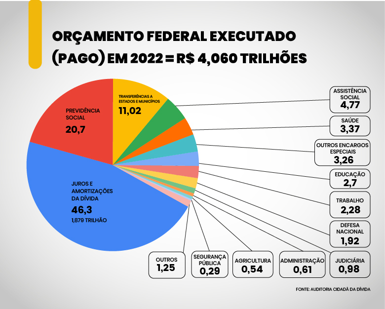 Segundo a Auditoria Cidadã da Dívida, em 2022 o custo da dívida pública no Brasil consumia 46,3% do orçamento, um montante de R$ 1,89 trilhões. Esses valores são relativos ao pagamento de juros e amortização da dívida — puxado pela taxa Selic que hoje está em 10,75%.