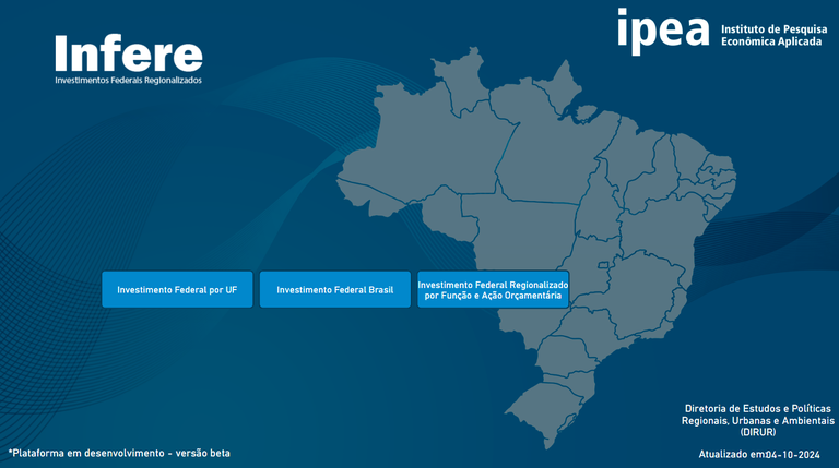 Um portal que mapeia a distribuição dos investimentos federais no Brasil, abrangendo os estados e regiões com base nos orçamentos Fiscal e da Seguridade Social entre 2001 e 2020. A plataforma Infere (Investimentos Federais Regionalizados), foi lançada a partir de uma parceria entre o Ministério da Integração e do Desenvolvimento Regional (MIDR) e o Instituto de Pesquisa Econômica Aplicada (Ipea).